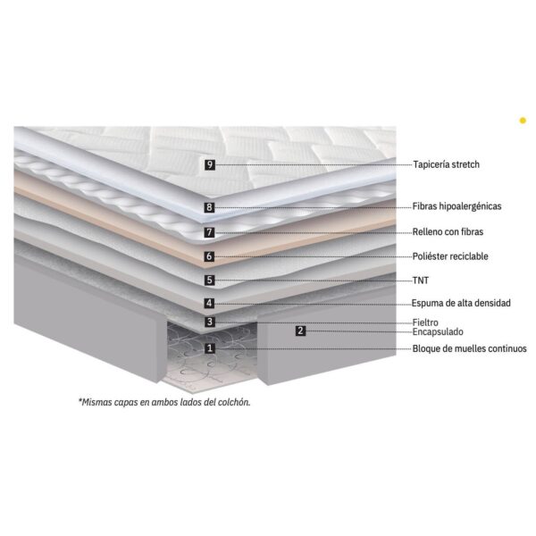 Colchón Mash (Grupo Flex) de muelle continuo y relleno de fibras hipoalergénicas, con una firmeza óptima.